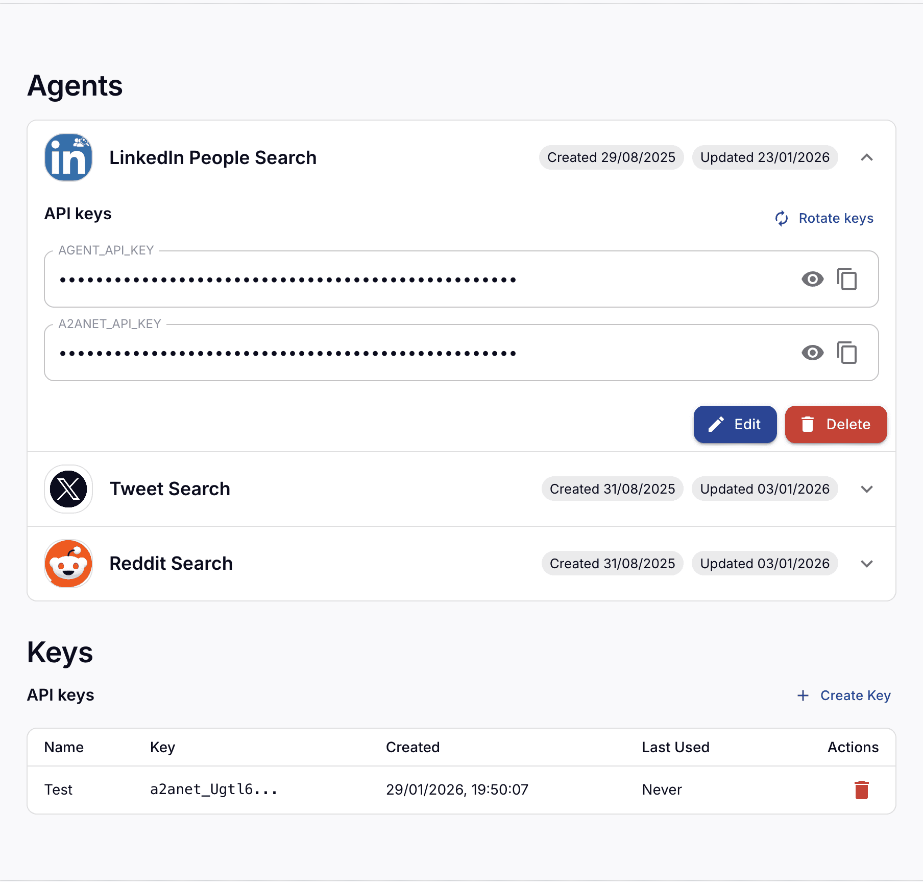 Add agents created with the A2A Agent Builder or add existing A2A agents. Search for agents with vector search. View Agent Cards, skills, examples, etc.